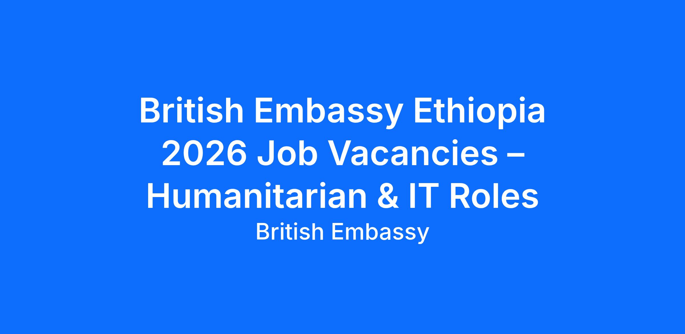 Etcareers is pleased to announce new employment opportunities at the British Embassy in Ethiopia for 2026. The Embassy, located in Addis Ababa, is recruiting skilled professionals to join its dynamic team. Current openings include a Humanitarian Programme and Policy Officer and an IT Support Officer, both full‑time positions based in Addis Ababa. These roles offer candidates the chance to contribute to the Embassy’s mission, spanning development and diplomatic initiatives. Interested applicants are encouraged to review the requirements carefully and apply before the stated deadline.