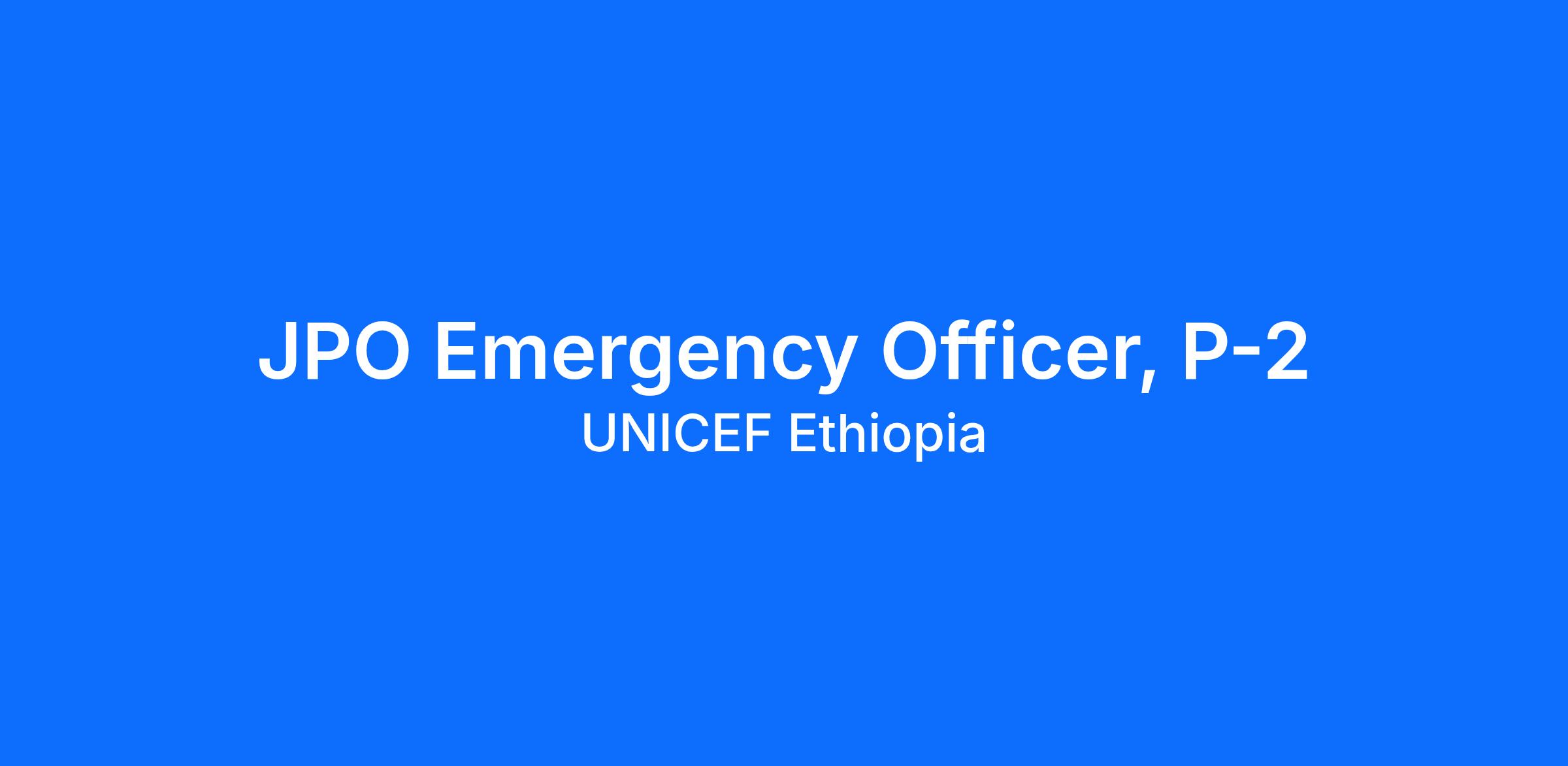 The Emergency Officer JPO supports the timely and effective delivery of emergency assistance to children and affected communities. The role focuses on responding to crises such as natural disasters, conflicts, and disease outbreaks. The JPO coordinates public health–related emergency responses with UNICEF Ethiopia sections and partners, enhancing preparedness, anticipation, and response capacity. The emergency officer develops and strengthens emergency preparedness and contingency plans, conducts risk assessments to identify and mitigate potential threats, and ensures interventions are well-coordinated and efficient. He/She is responsible for monitoring that evolving emergency situations, collecting data on affected populations’ needs, and supporting resource mobilization—both financial and logistical—are key responsibilities. Overall, the JPO contributes to planning, coordination, monitoring, reporting, and capacity building in emergencies, strengthening UNICEF’s ability to deliver life-saving assistance.