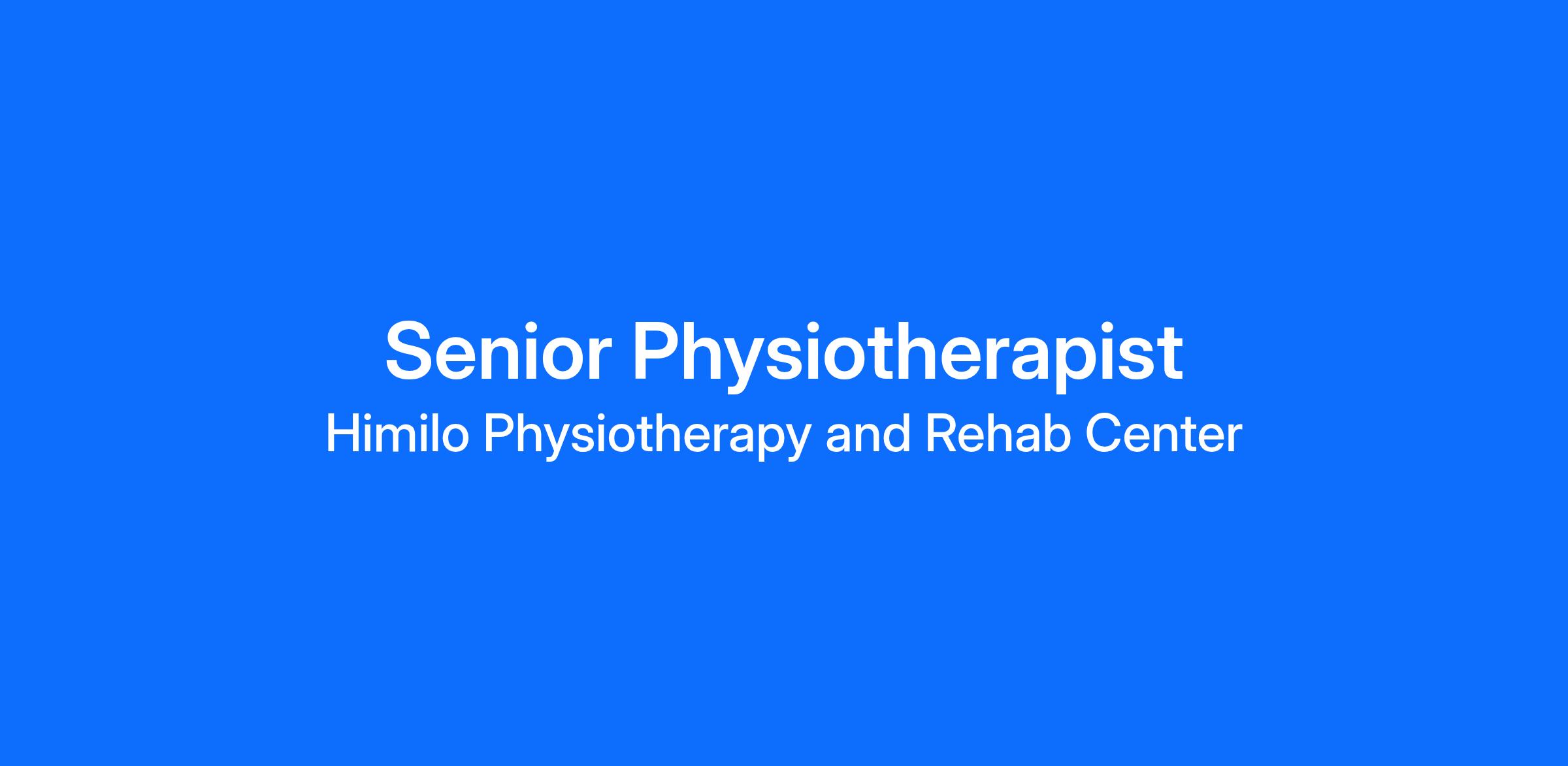 Himilo Physiotherapy and Rehab Center is seeking a qualified and experienced Senior Physiotherapist to lead and deliver high-quality rehabilitation services. The successful candidate will be responsible for assessing, diagnosing, and treating patients with physical impairments, disabilities, and injuries, while also supervising and guiding support staff to ensure excellence in patient care.