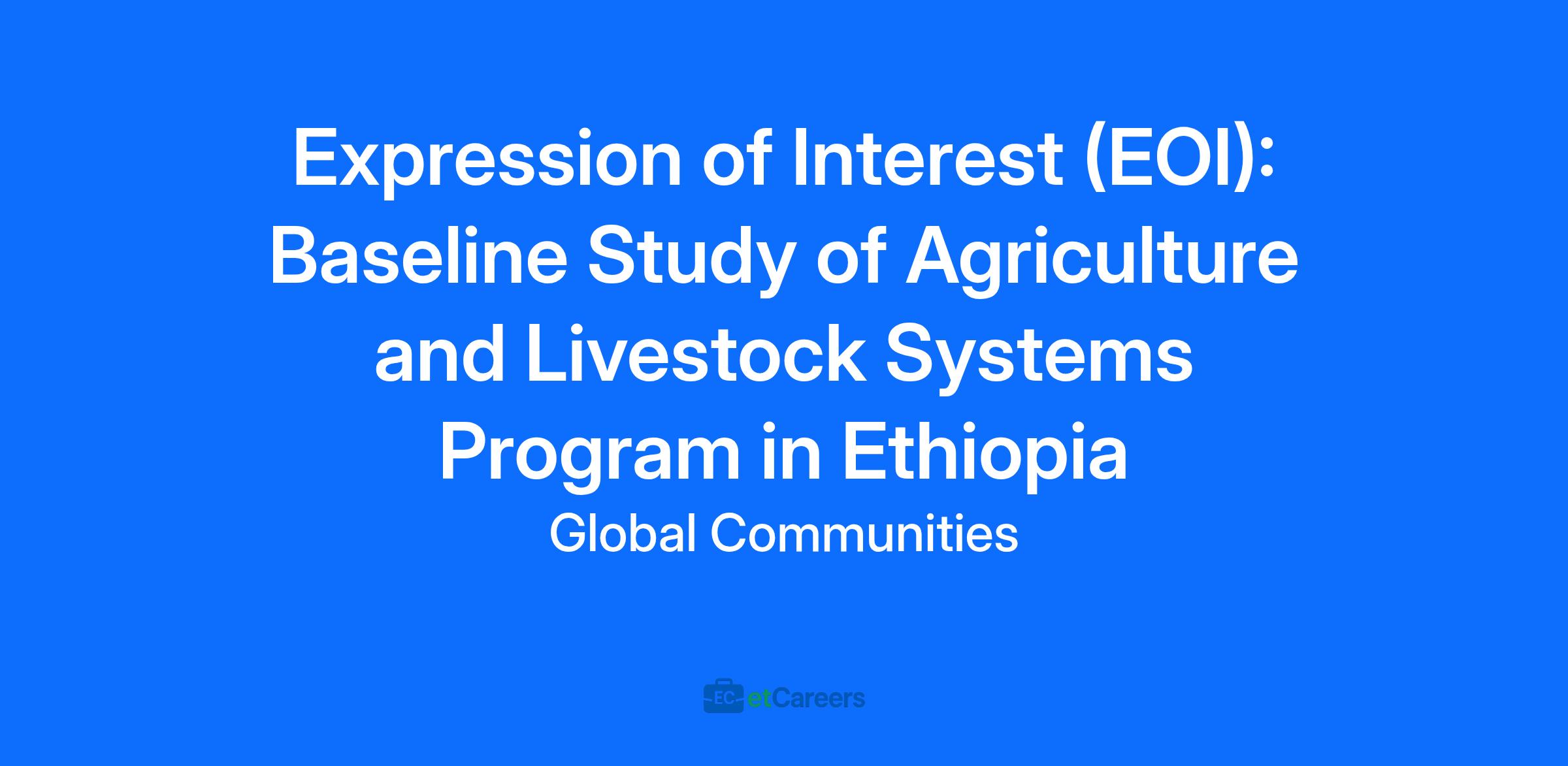 Global Communities, in partnership with key stakeholders, is seeking Expressions of Interest (EOIs) from qualified research and evaluation firms to conduct a baseline study for a multi-year Agriculture and Livestock Systems Program in Ethiopia.